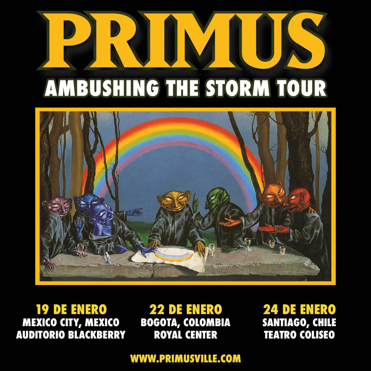 El trió Californiano regresa al país tras 5 años de ausencia. Primus, visitara el Auditorio BlackBerry el próximo 19 de enero y el costo de los boletos oscilan entre los $1,066 y $1,566 pesos.